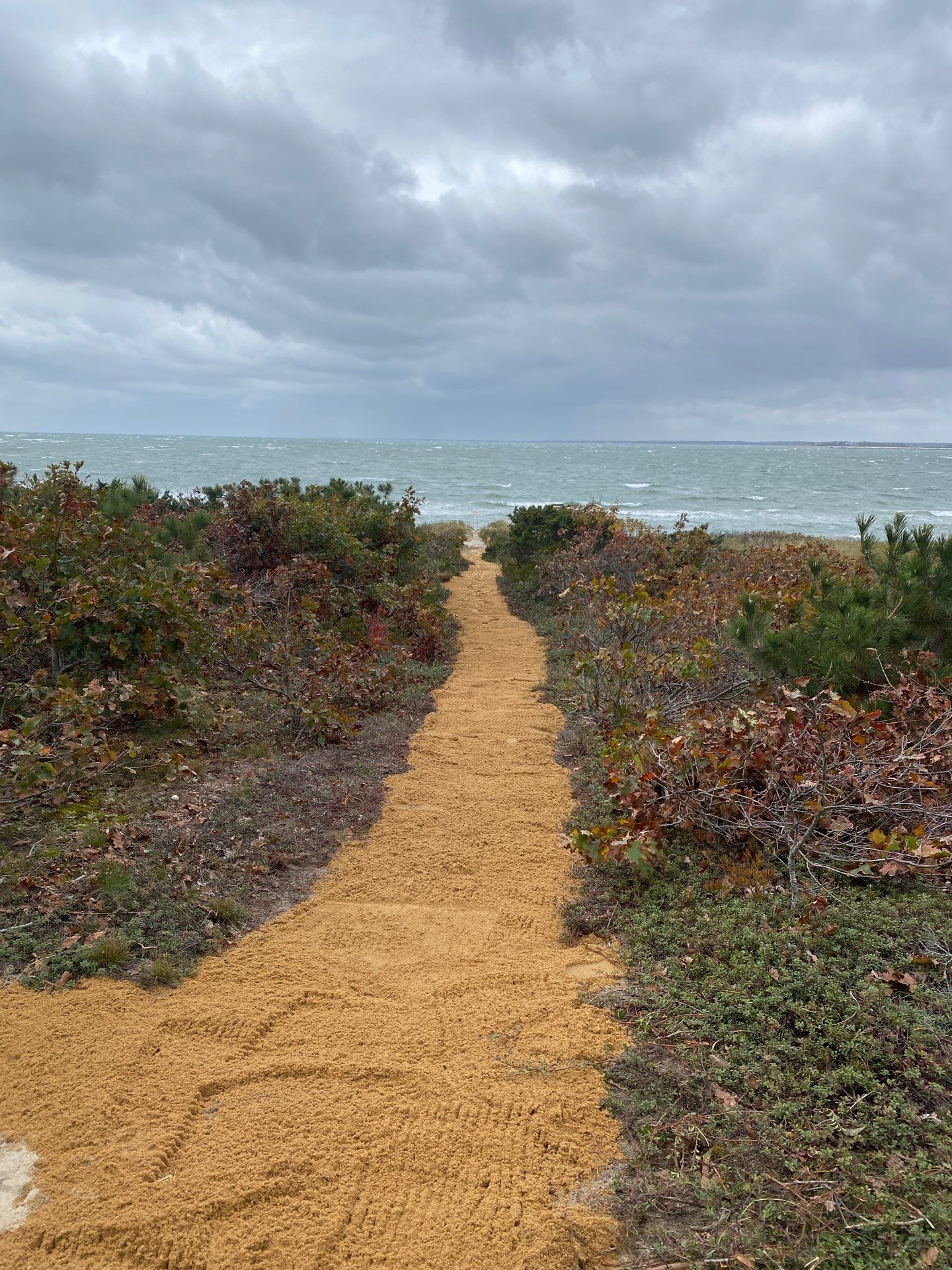 Helical pile supported boardwalk and staircase. Marine grade pressure treated timber framing with 5/4" x 6" Ipe hardwood decking with Ipe hardwood handrail. Lower section of staircase is removeable. Sand replenishment on natural footpath.
