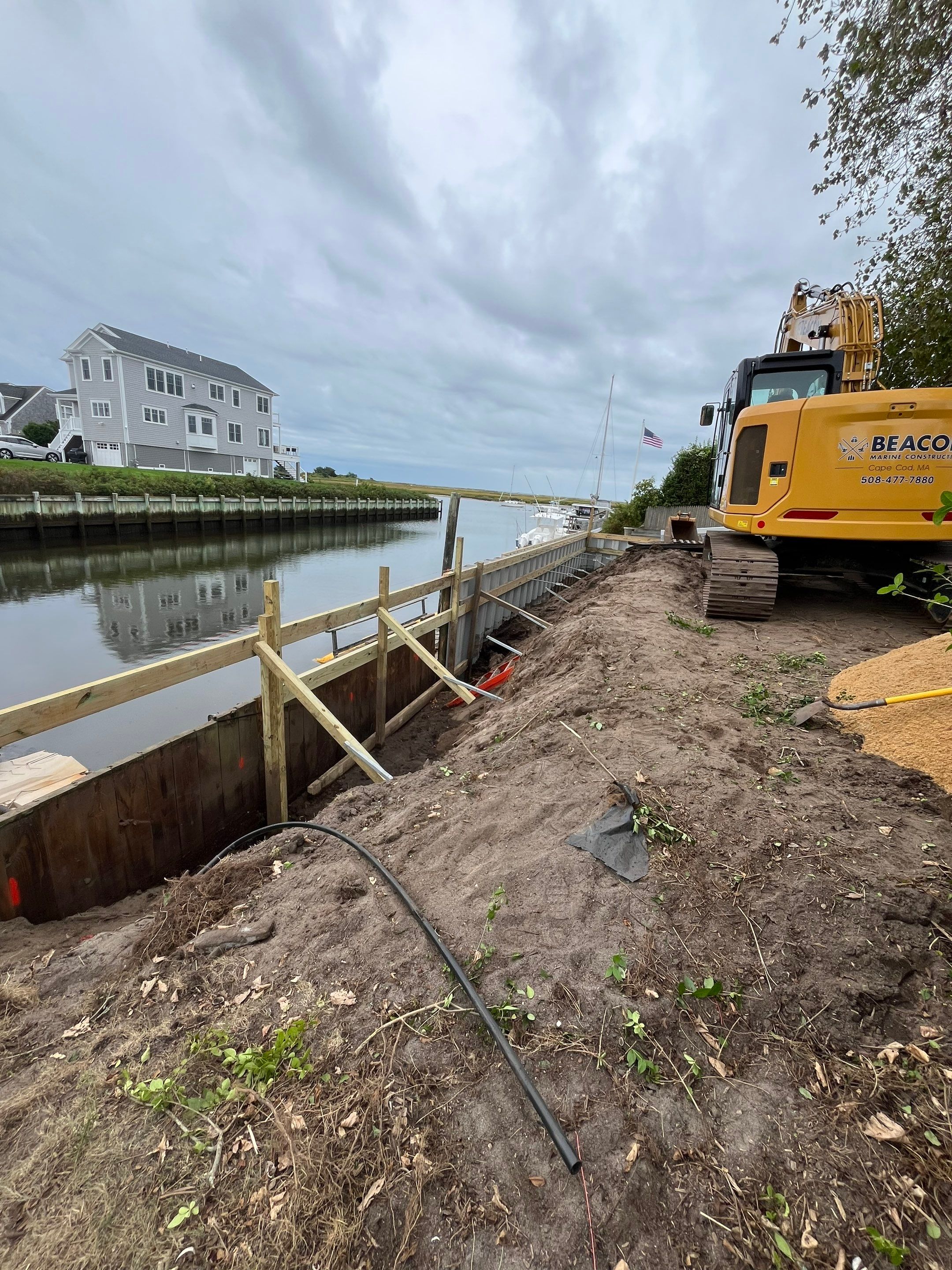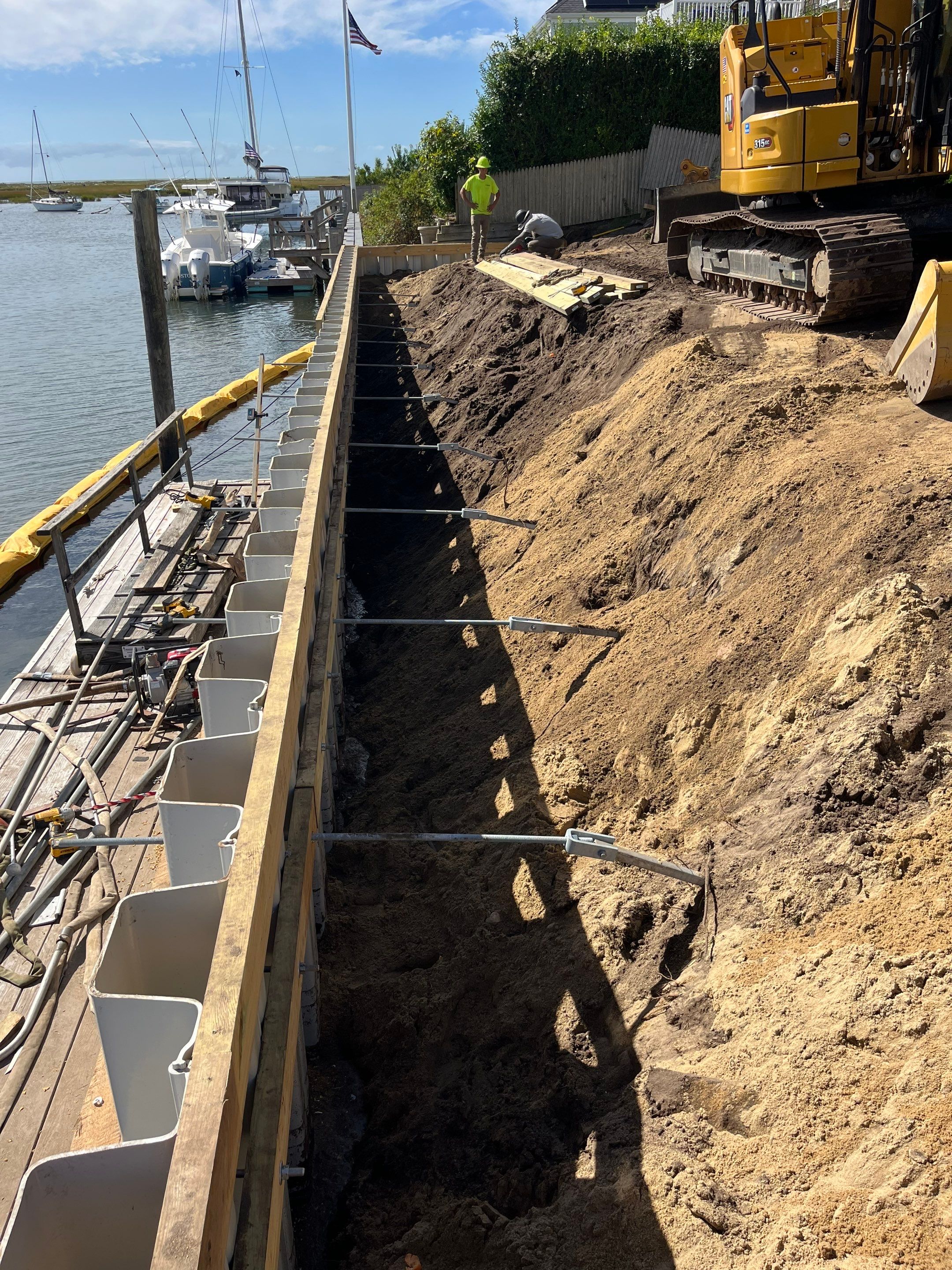 This 75' run along the lagoon with two 15' returns along the property lines. The vinyl sheeting is constructed segmentally in 20' sections in conjunction with removal of the existing wall. Helical pile tiebacks were installed to anchor the wall with minimal disruption to the yard.